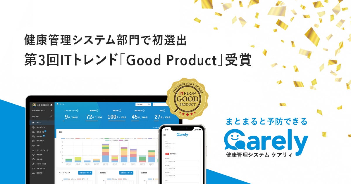 「ITトレンドGood Product」とは、IT製品の比較・資料請求サイト「ITトレンド」に投稿された実際に利用しているユーザーからの評価に基づいて特に満足度の高い製品・サービスに贈られます。第3回となる今回は約71,000件のレビューを集計し、286製品・サービスが受賞となっており、「健康管理システム部門」ではCarelyが初受賞・唯一の受賞となりました。