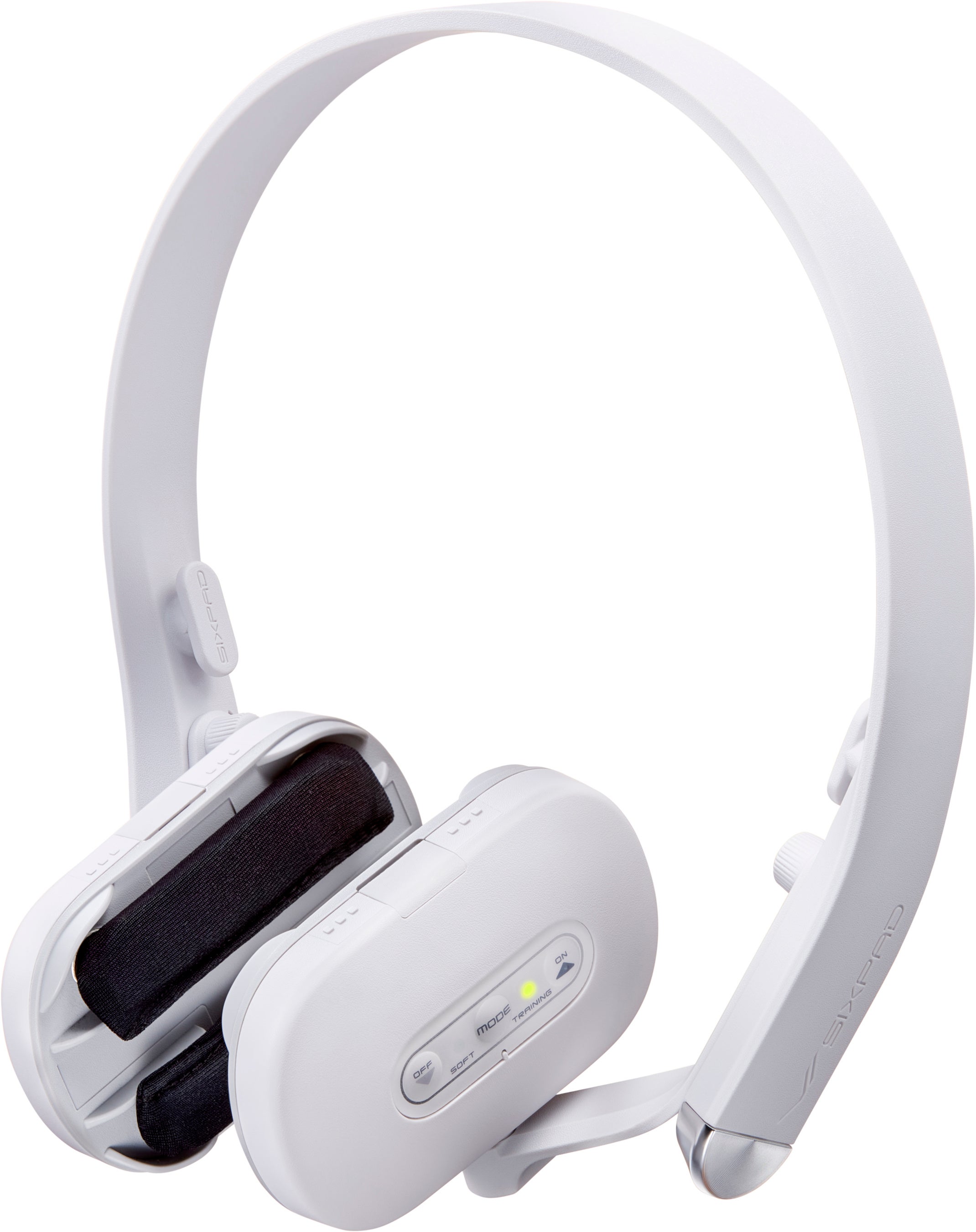 2.本体にサポートバンドを取り付け、本体を頭にフィットさせます。サポートバンドを頭の中央にセットしたら、電極が左右の頬の正しい位置にくるように角度や位置を調整します(頬以外の場所にあてて使用しないでください)。
