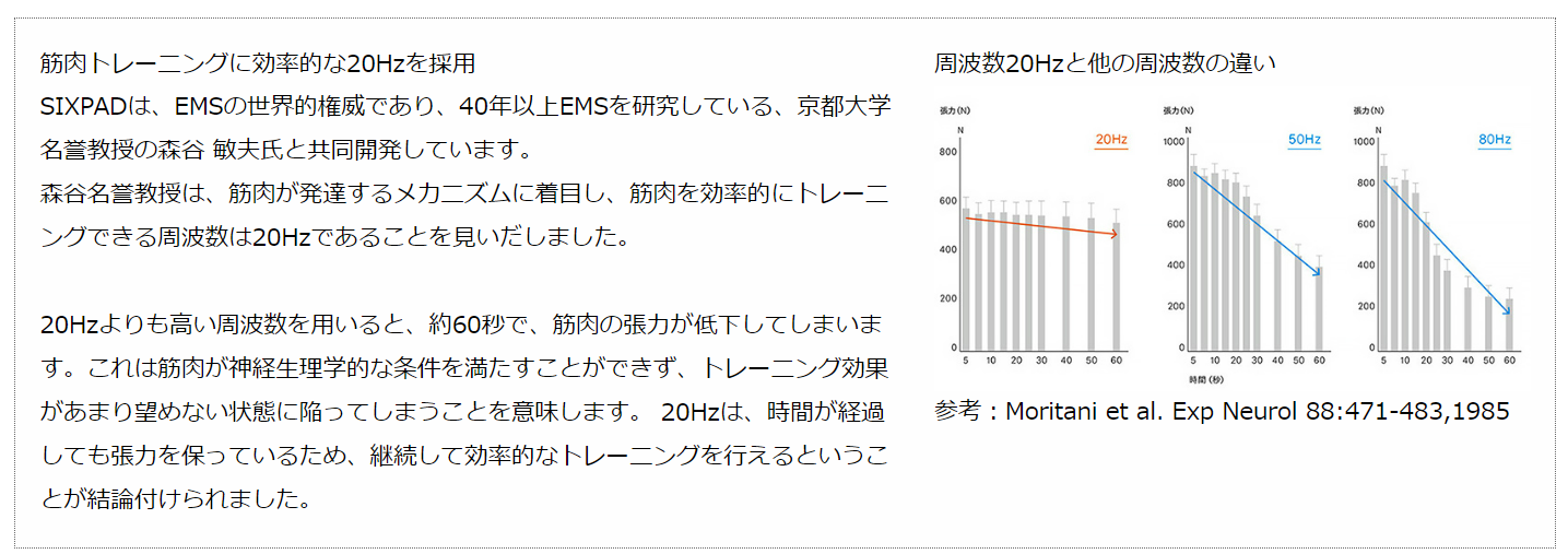 コアとなるEMS(Electrical Muscle Stimulation=筋電気刺激)は、安全性を第一に配慮し、適切な体感とトレーニング効果を両立した、独自テクノロジーの 「CMM Pulse (シーエムエムパルス)」を開発。唯一無二のCMM Pulseは、EMSを40年以上研究し、トレーニングに効率的な周波数20Hzを見出した、京都大学名誉教授 森谷 敏夫氏の理論、低い周波数特有の痛みを解決したMTGの独自波形、世界的トップアスリートのトレーニング理論を融合して誕生しました。SIXPADのコアテクノロジーとして、すべてのEMS商品に搭載しています。