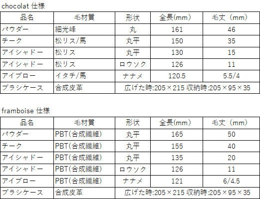2023年のコレクションは松リスや、山羊の中でも高品質な細光峰などを使用しワンランク上のメイクをお楽しみいただける「chocolat」と、天然毛を使わず、筆作りの技術を生かしたこだわりの穂先で、天然毛のような優しい肌あたりをお楽しみいただける「framboise」です。