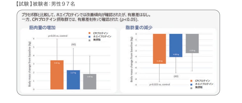 こちらは男性97名にCPIプロテインとWPIプロテインを飲んでトレーニングした際の筋肉量と脂肪量の変化の結果です。結論、CPIプロテインを摂取した方が、筋肉量の増加が一番見られて、脂肪の減少も一番確認されました。実は、CPIプロテインは、WPIホエイプロテインよりもトレーニング効果がより見込まれる原材料として証明されています。