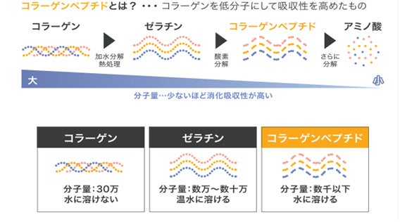 コラーゲンペプチドとは、簡単にいうと“コラーゲンを低分子にして、吸収性を高めたもの”です。今までコラーゲンは肌にいいとされてきましたが、実は、コラーゲンは経口摂取では実際には体に吸収されず、あまり効果がないとされていました。しかし、最近の研究から分子鎖を低分子にしてペプチド状にすることでさまざまな特性を示すことがわかってきております。