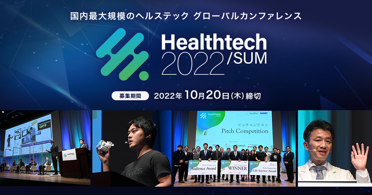 メドピア株式会社(東京都中央区、代表取締役社長 CEO:石見 陽、以下メドピア)と日本経済新聞社(東京都千代田区、代表取締役社長:長谷部 剛、以下日本経済新聞社)は、ヘルステックのグローバルカンファレンス「へルステック・サミット(以下Healthtech/SUM)」を2022年12月1日(木)・2日(金)の2日間で共同開催いたします。その2日目午後に開催する「ピッチコンテスト」の開催概要を公開し、出場者の応募受付を開始いたしましたのでお知らせいたします。なお、応募期間は本日から2022年10月20日(木)までです。
