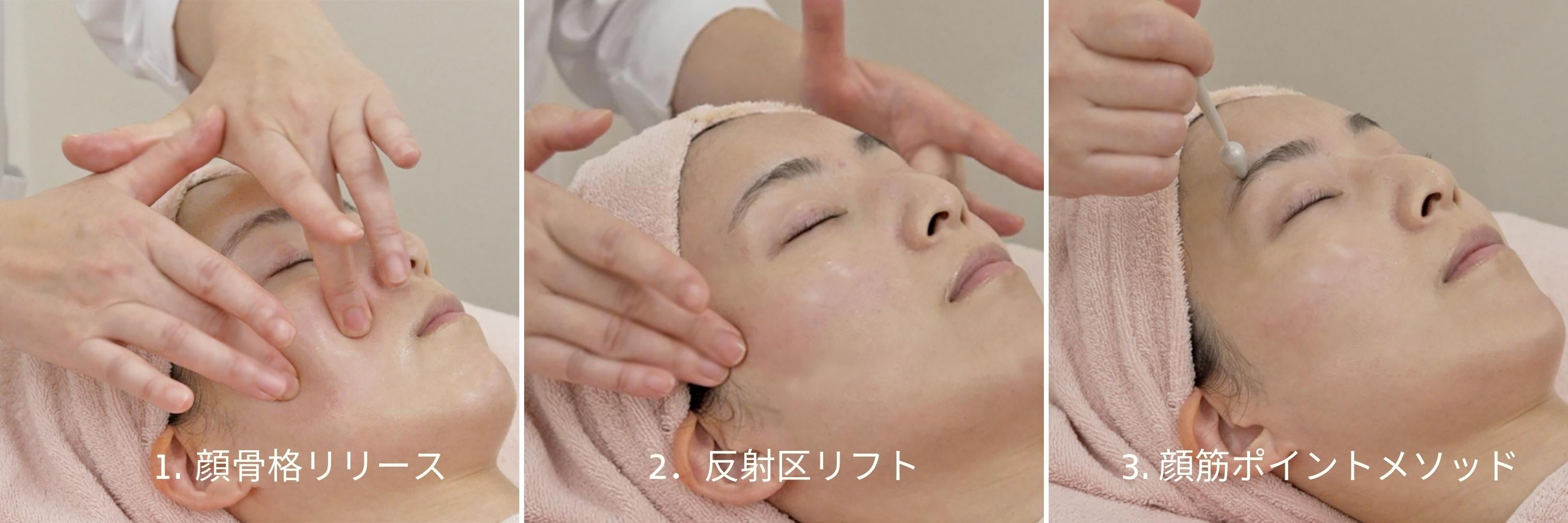 施術に先立つカウンセリングで心身の状態を把握し、肌に適したオイルやクリームを選定・塗布します。 次にお客様の状態に最適な顔のツボ反射区に対して繊細なハンドテクニックと 整顏ケアツールによる「ささない鍼刺激」で、深いところにある不調の原因へアプローチ。 骨格・顔筋・リンパ・血流・経絡・ツボを一気に捉えて押しほぐし、自律神経バランスを整えます 。