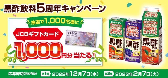 コーヒーミルクポーション最大手・メロディアン株式会社(本社:大阪府八尾市、代表取締役社長:中西優紀雄、以下、「当社」)は、機能性表示食品「黒酢飲料りんご味200ml・1000ml」の発売5周年を記念して、抽選で1,000名様にJCBギフトカード1,000円分が当たる『黒酢飲料5周年キャンペーン』を9月20日(火)より開催します。