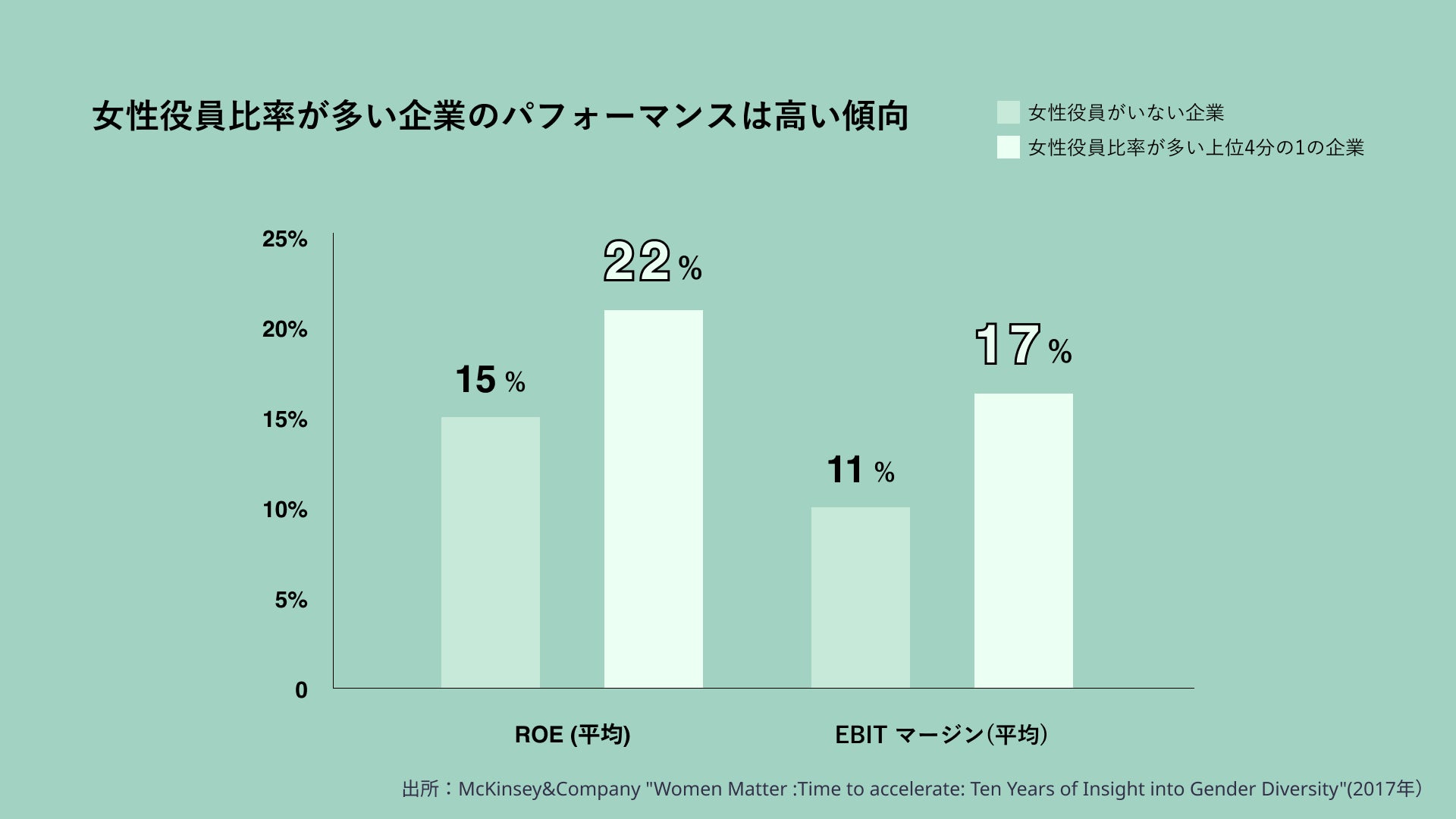(投資家サイドも、2019年実施の内閣府の調査で、7割近くの機関投資家が投資に女性活躍情報を活用する理由として”女性の活躍推進が企業の業績に長期的に影響があると考える”と回答。女性役員比率の多い企業の方がパフォーマンスが高くなるという結果も)