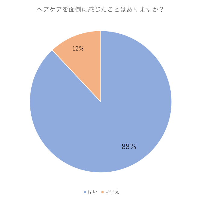 自宅でのヘアケアを面倒だと感じているか?の質問には、なんと【88%】の方が「はい」と回答。