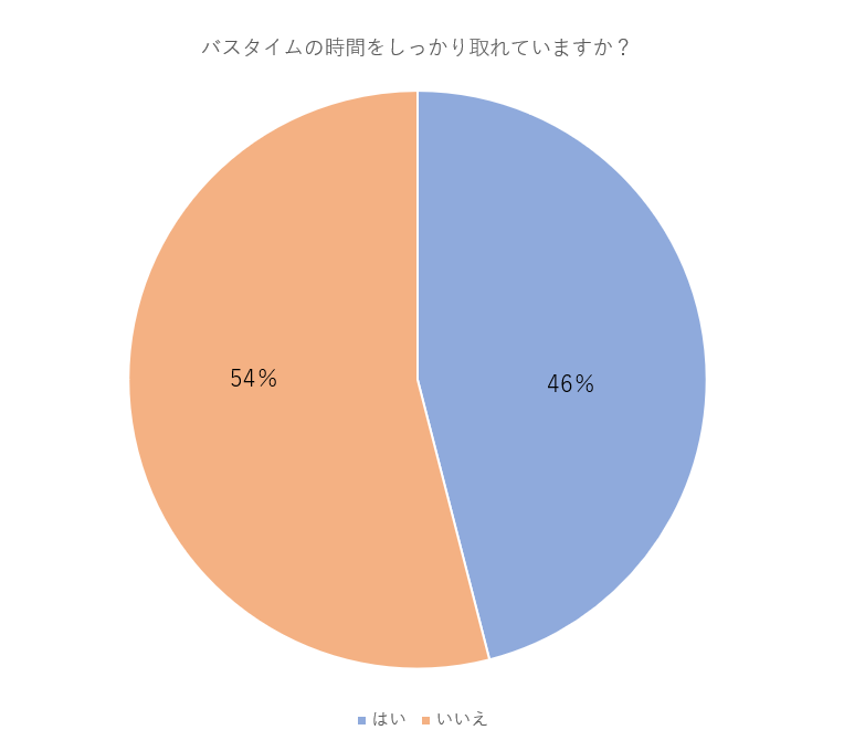 →バスタイムの時間をしっかり取れていますか? の質問には、半数を超える【54%】の方が取れていないと回答。