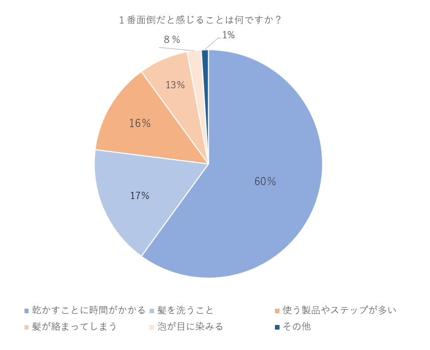 →半数以上の方が「乾かすことに時間がかかる」という回答でした。それ以降はお風呂の中でのヘアケアについての回答が集まっており、「髪を洗うこと」が17%「使うステップが多い」が13%という結果となりました。