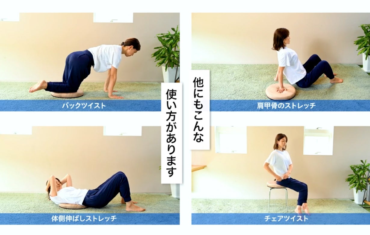 バッグツイスト、肩甲骨のストレッチ、体側伸ばしストレッチ、チェアツイストなどのトレーニングの他、床座りのまま方向転換をしたり立ち上がる際の重心移動の補助にも役立つ便利アイテムです。