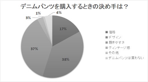 次に、「デニムパンツを購入するときの決め手は?」というアンケートも行いました。すると、一番多い回答は「デザイン」で38%でした。