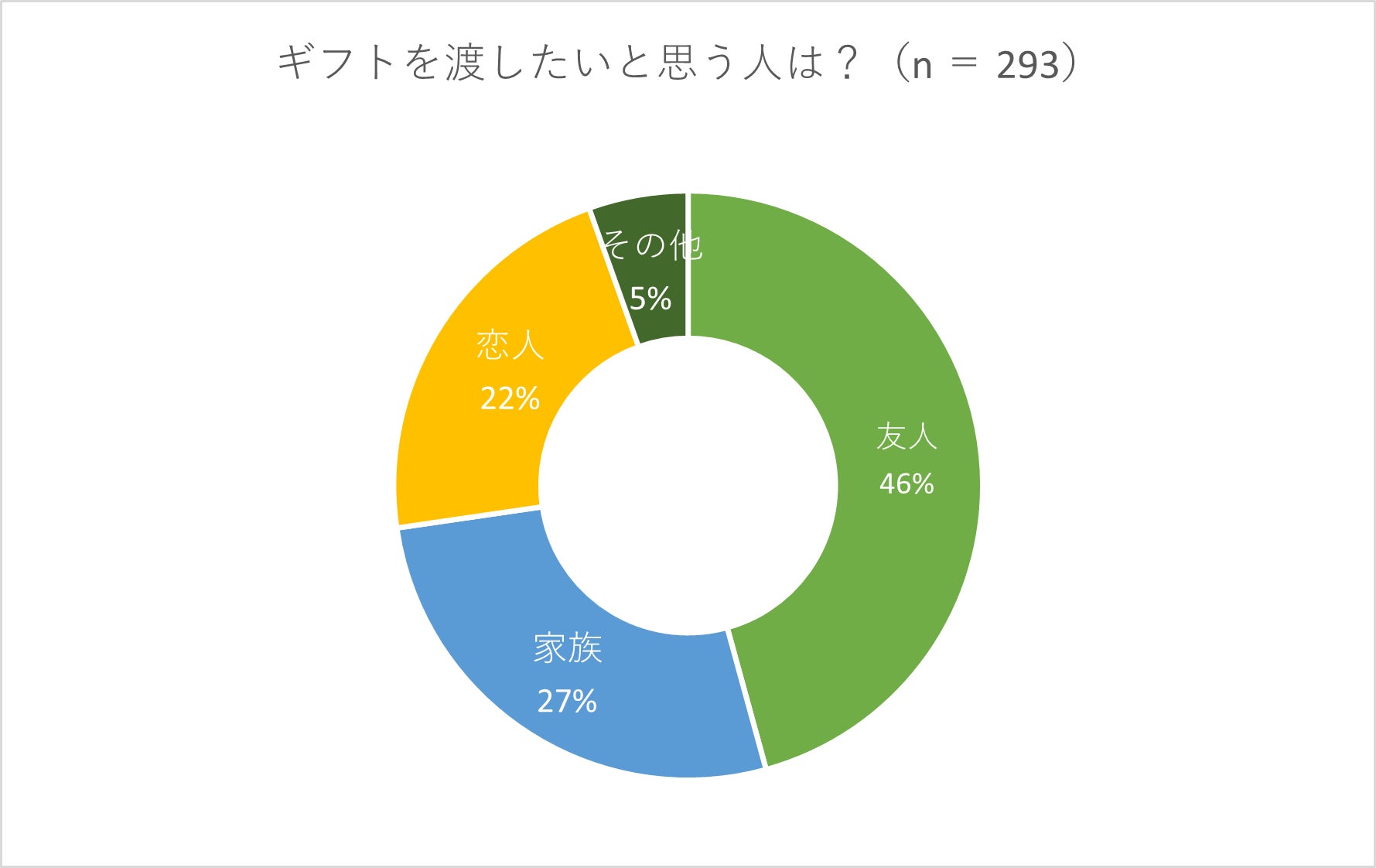 本調査では、まず、1年間にギフトを贈る回数について調査。 1~5回程度の人は65%、6~10回程度の人は 26%と 、 ギフトを日常的に渡す人が多いことが判明。 また、ギフトを渡したい相手としては、1位は友人が46%と半数近くを占め、続いて家族27%、恋人22%、その他5%という結果になりました 。また、特別なギフトとして思い浮かぶものは、「(贈る相手が)自分では買わないもの 」「渡すときにときめくもの」「名入れアイテム」等 の意見が上がり、心に残るような想いのこもったギフトを選ぶ傾向が表れました 。