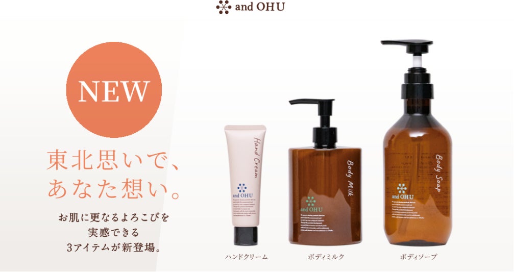 「and OHU(アンオフ)」は、東北の作り手が見える素材を使い、発酵由来のやさしさで機能性豊かな原料を抽出。生産工程で出る発酵粕も無駄なく使う取り組みなど、環境に配慮したモノづくりを徹底したスキンケアシリーズです。2021年12月1日より薬王堂全店舗(東北6県371店舗)およびECサイトで販売しているクレンジングオイル、フェイスウォッシュ、モイスチャーローション、モイスチャーミルク、リップクリーム、オールインワンジェルは、岩手産の植物由来成分をふんだんに使用、北国発信ならではの保湿にこだわったスキンケア商品として大変好評をいただいております。
