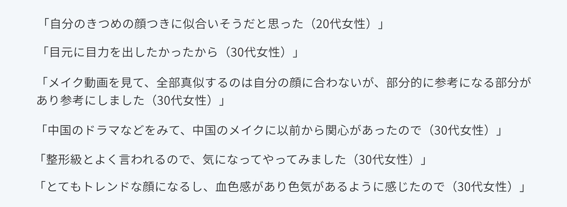 対して「チャイボーグメイクを参考にしたことがある」という人に「なぜ参考にしようと思ったのか?」を尋ねたところ、次のような回答が得られました。