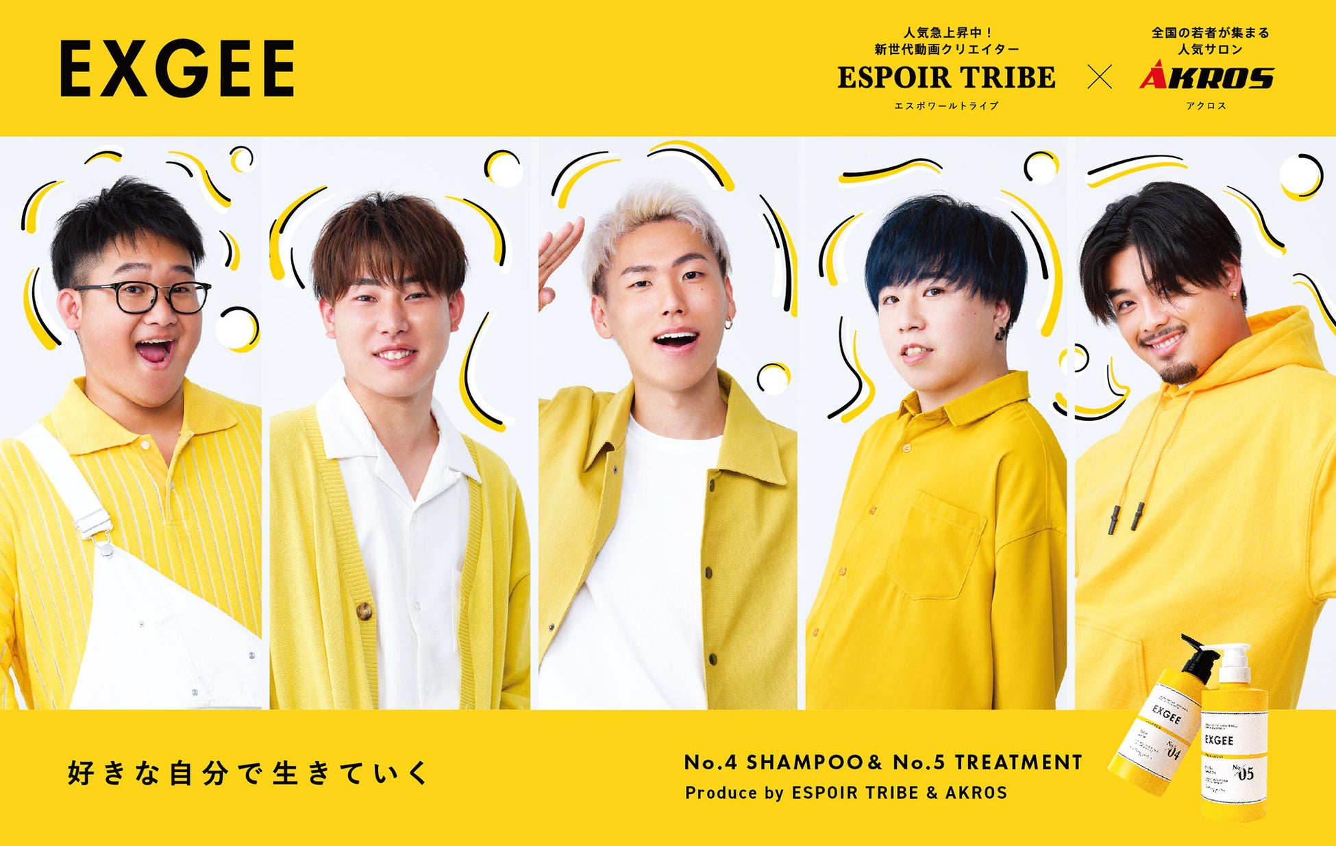10代後半から20代の男性を中心に人気を集めている現在人気急上昇中の5人組動画クリエイター「ESPOIR TRIBE-エスポワール•トライブ-」(以下、ESPOIR TRIBE)プロデュースのヘアケアブランド「EXGEE(エグジー)」より、新商品シャンプー・トリートメントの発売が決定いたしました。