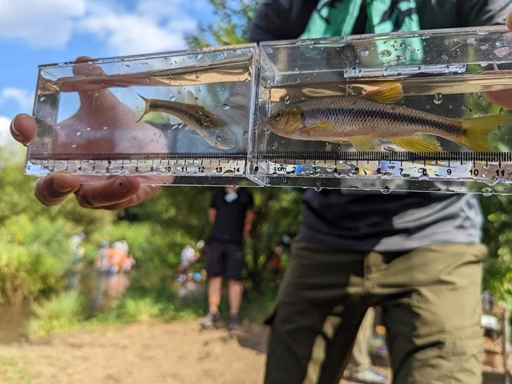 ツアー後半では、タモ網を使った”ガサガサ”と呼ばれる方法で魚や甲殻類、水生昆虫をツアー参加者ご自身で捕獲・観察し、童心に帰って落合川の生きもの探しをお楽しみいただきました。