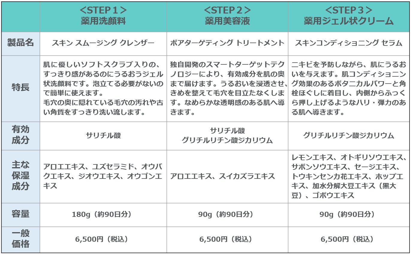 ニキビができるメカニズム(過剰皮脂、角質肥厚、アクネ菌の増殖)とトータルスキンケアから着想を得て、いつでも心地よく使えるテクスチャーとニキビ予防と美肌育成にこだわり、敏感な日本人の肌質に着目した処方を再開発しました。