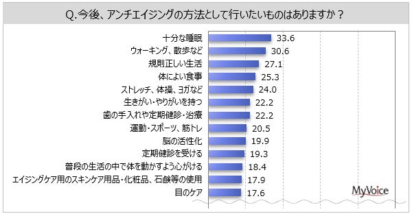 今後、アンチエイジングの方法として行いたいものは(複数回答)、「十分な睡眠」「ウォーキング、散歩など」「規則正しい生活」が3割前後です。