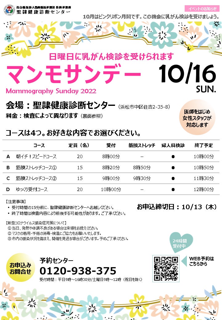 社会福祉法人 聖隷福祉事業団(法人本部:静岡県浜松市/理事長:青木善治)の健診機関、聖隷健康診断センター(所長:武藤繁貴)は乳がん検診の啓発を目的とした「マンモサンデー」を2022年10月16日(日)に開催します。
