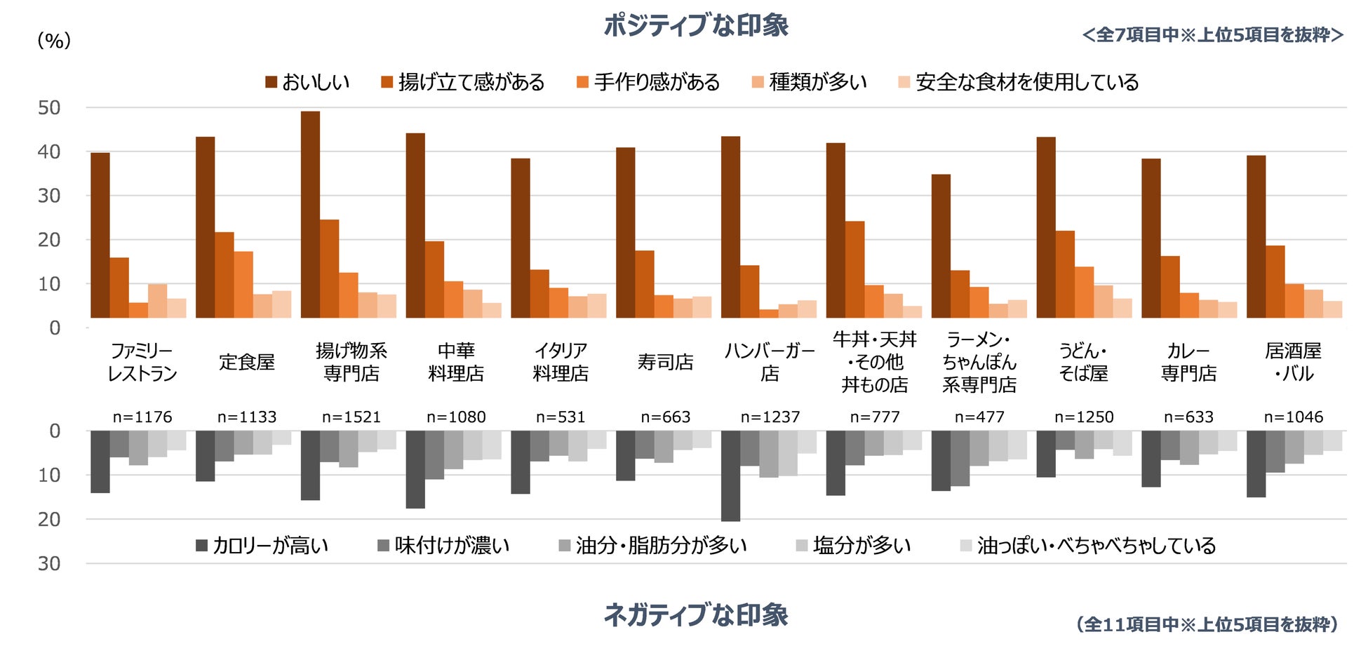揚げ物メニューに対するポジティブな印象は、すべてのジャンルの外食店で「おいしい」が最も多く、「揚げ立て感がある」「手作り感がある」などが上位に挙がりました。ネガティブな印象は、すべてのジャンルの外食店で「カロリーが高い」が多く挙がりました。(レポート9頁参照)