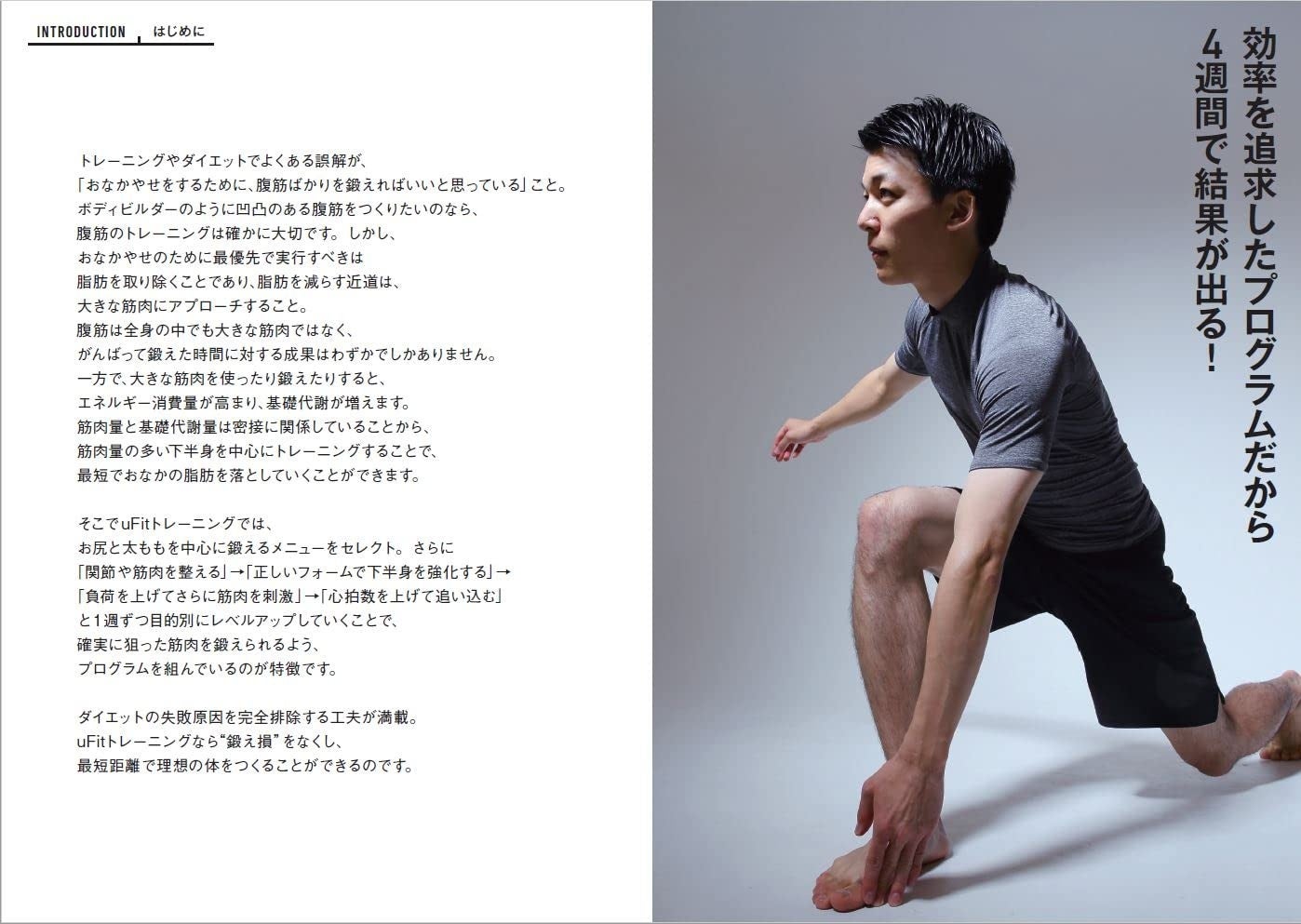 本書で紹介している「uFit トレーニング」は、「忙しくて続かない」「効果が現れずに挫折してしまう」といった悩みを抱える方に向けて、時間効率を優先した自重のトレーニングプログラムです。脂肪を効率的に減らすため、下半身を中心としたメニューとなっています。