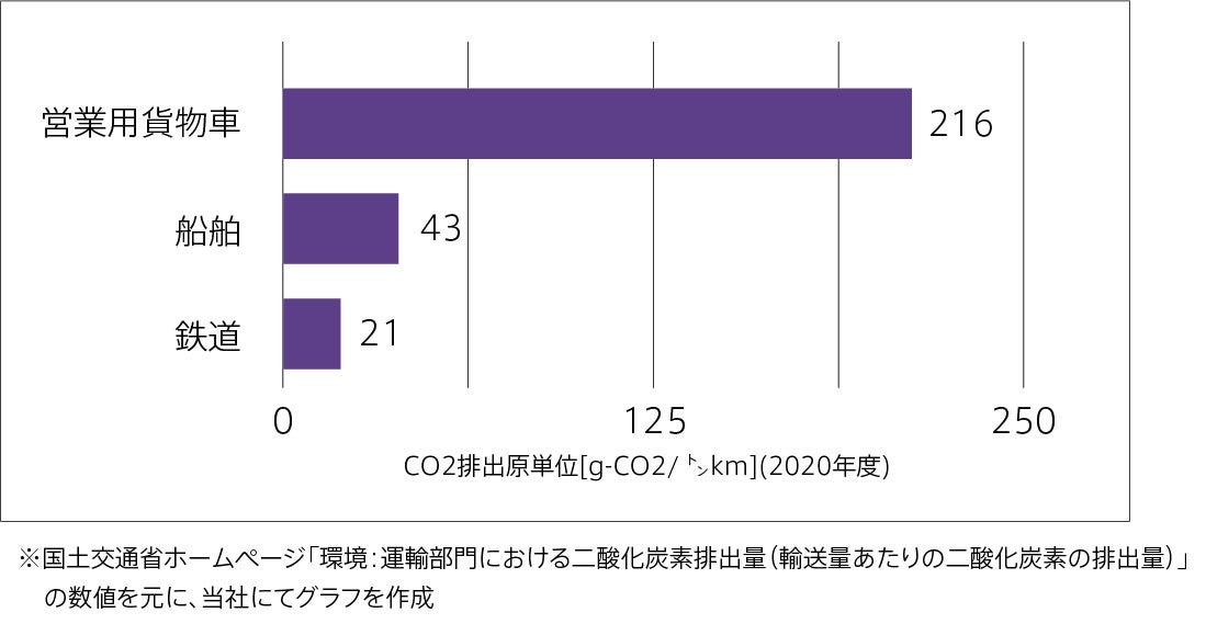 貨物輸送において、各輸送機関から排出される二酸化炭素の排出量を輸送量(トンキロ:輸送した貨物の重量に輸送した距離を乗じたもの)で割り、単位輸送量当たりの二酸化炭素の排出量を試算すると下図の通りになり、営業用貨物車に対するCO2排出量は、船舶が1/5、鉄道の場合は1/10となります。
