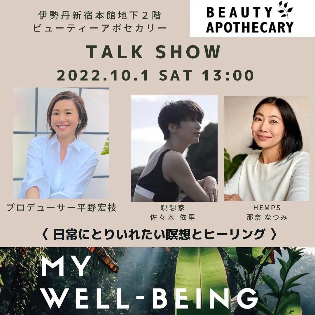 プロデューサー平野宏枝氏がナビゲートとなり、無料トークショーを開催、HEMPSブランドディレクター那奈なつみとCBD RESCUE マインドフルネスオイル -Beyond-監修者である瞑想家の佐々木依里氏が登壇します。