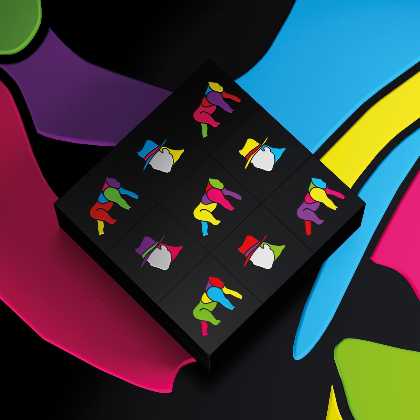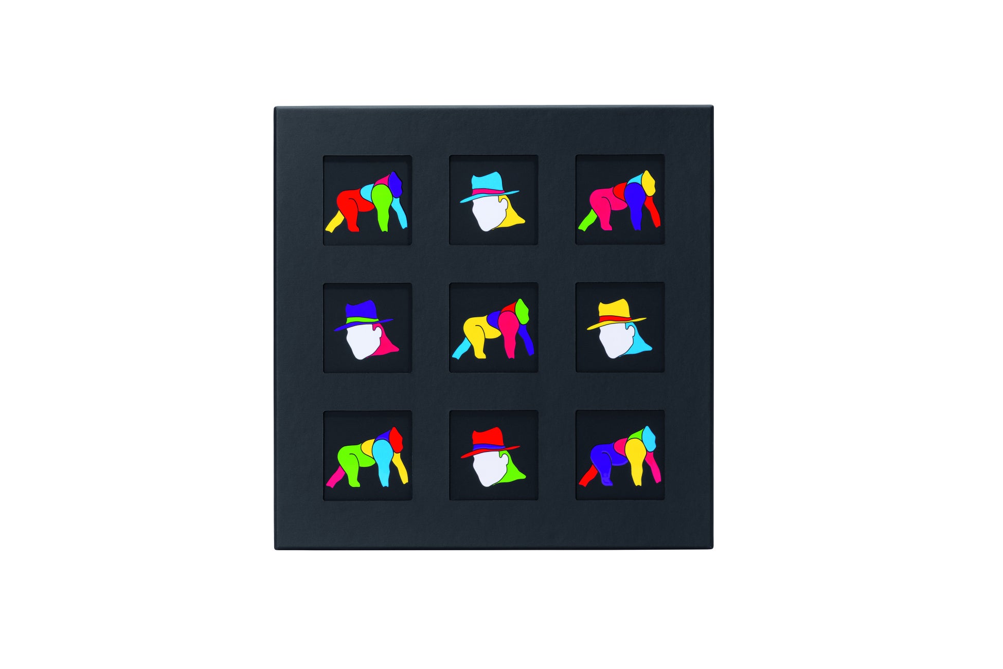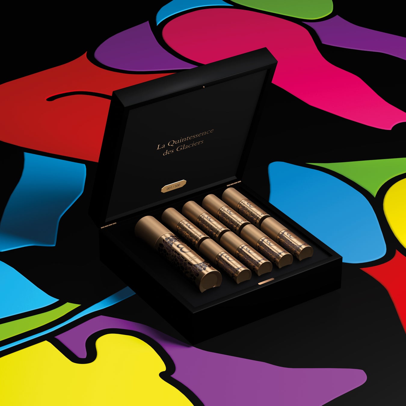 レリクシール デ グラシエの誕生から20周年を記念して製作されたひとつめの2021年版は、四角形で構成されたエレガントなアールデコのデザイン。それに続く今年2022年版は、1960年代に一世を風靡したポップアートからインスピレーションを受け、アイコンとなるモチーフを反復表現したカラフルなデザイン。帽子をかぶった女性(ヴァルモングループCEO・ソフィー・ヴァン・ギヨン)と、ディディエの近年の作品でもあるゴリラのアイボが交互に現れる、遊び心に満ちた新しい構図。ハンドメイドの木製ケースにミネラルレザーの縁取りが施されたビジュアルは、エネルギーに満ちあふれています。