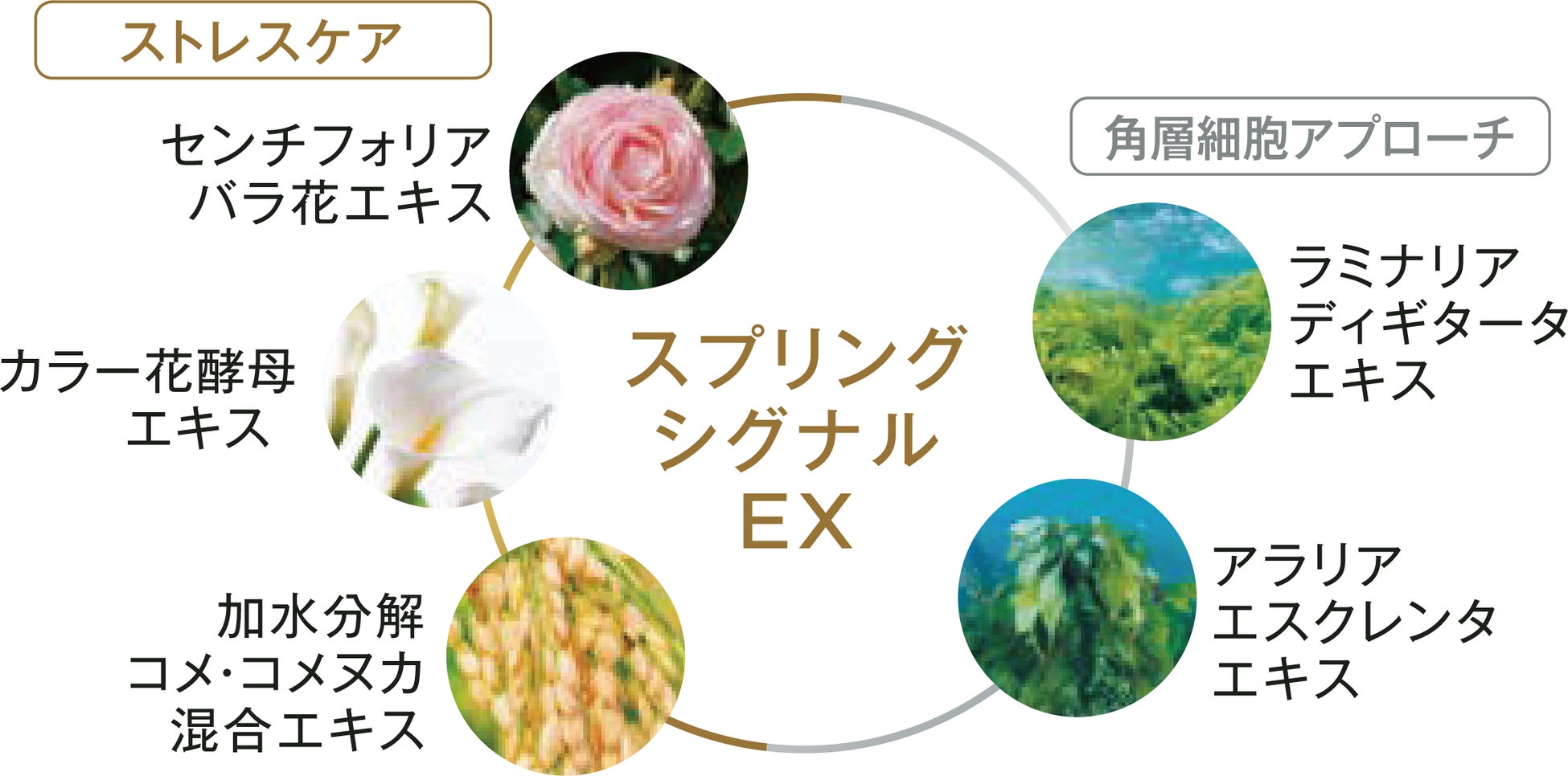 *スプリングシグナルEX:ラミナリアディギタータエキス、加水分解酵母、加水分解コメヌカエキス、アラリアエスクレンタエキス、センチフォリアバラ花エキス、加水分解コメエキス