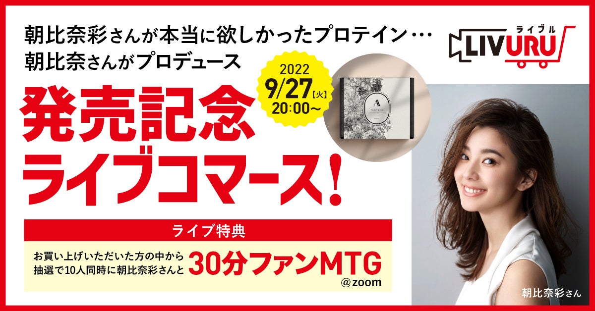 戦略型ライブコマースの「LIVURU(ライブル)」(https://livuru.jp/)を提供する株式会社テイラーアップ(所在地:東京都渋谷区、代表取締役社長:松村 夏海)は、女優として第一線で活躍する朝比奈彩さんがプロデュースするブランド「MYNATURA(マイナチュラ)」の「A(エー)プロテイン」のライブコマースを2022年9月27日に実施いたします。