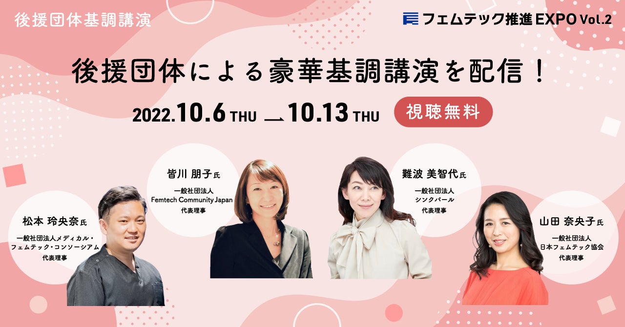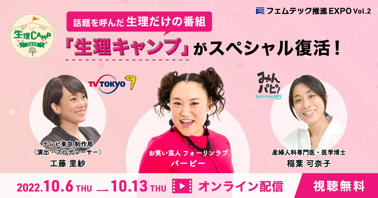 2020年テレビ東京で放送され話題を呼んだ生理特化型番組『生理CAMP』が今回、フェムテック推進 EXPO vol.2にてスペシャル復活!さらにスペシャルサポーターに就任いただいたフェムテック振興議員連盟事務局長 宮路拓馬議員によるご講演や、生理のあるあるから避妊の選択肢まで様々な切り口でフェムテックを語るコンテンツを多数ご用意しています。