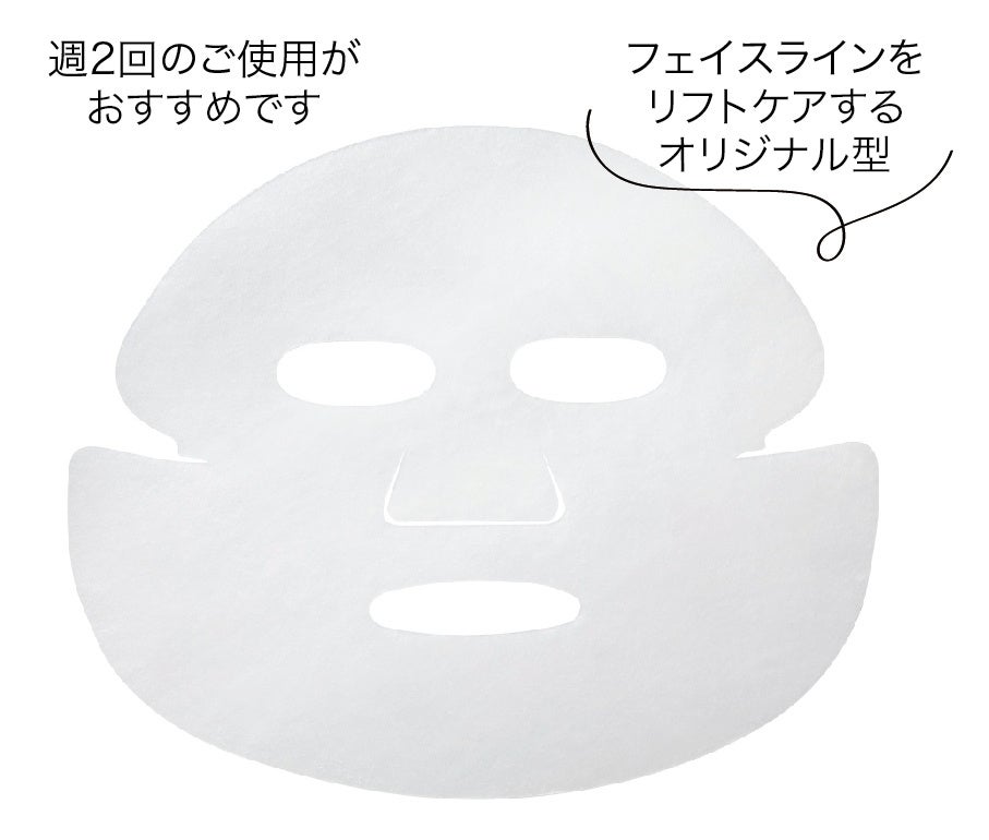 フェイスラインに沿って引っ張り上げ、リフトケアできるオリジナル型。シートにはコットン100%の特殊素材を採用。吸水性に優れ、美容液を余すことなく吸い込んで肌へ送り込み※7ます。つるつる、もっちりとした上質な肌あたりで密着し、顔全体を心地良く包み込みます。