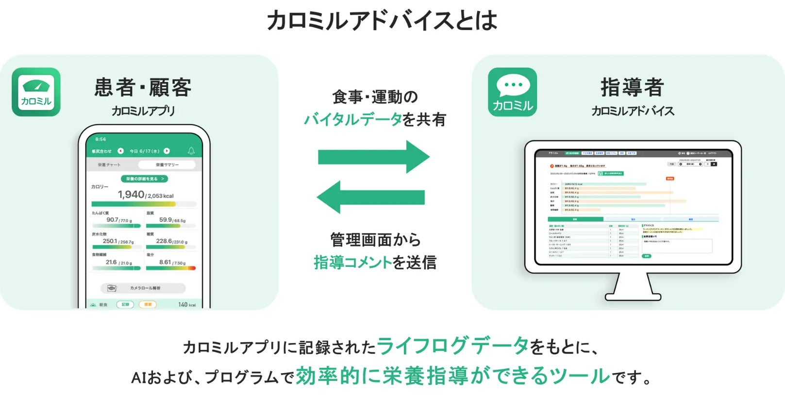 指導対象者(顧客)の「カロミル」アプリと連携し、食事や栄養指導がすべてオンライン上で完結できる、指導者向けのウェブツールです。指導対象者(顧客)の食事データの記録・蓄積が自動化されるだけでなく、AIが食事内容を自動で解析・栄養計算し、指導者の栄養計算など食事指導にかかる手間が大幅に削減されます。