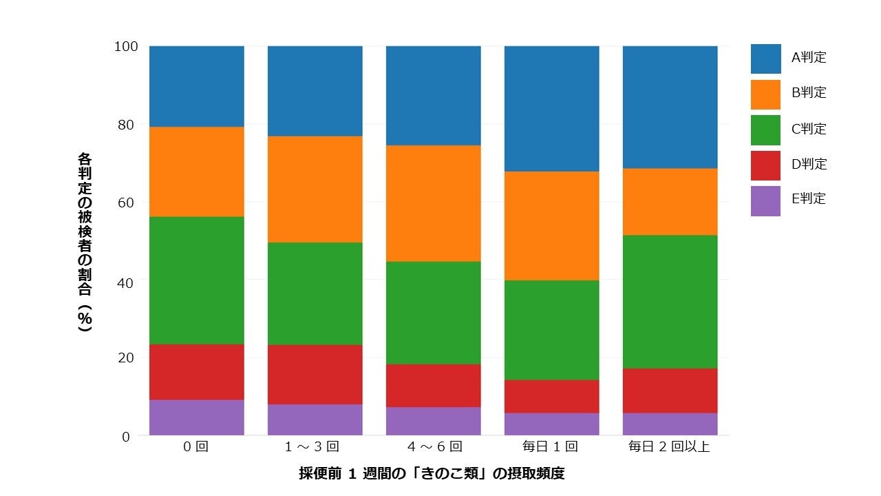 グラフから、「きのこ類」の摂取頻度が増えるごとにA判定の割合が高くなることがわかります。毎日 1 回以上 2 回未満の摂取群では、 A、 B 判定の方が半数を越えており、「きのこ類」の定期的な摂取が腸内フローラに良い影響であることがわかりました。ただし、毎日 2 回以上のケースにおいては、 A 判定、 B 判定ともに減少するため、その他の要因も含め腸内フローラになんらかの悪い影響があるかもしれません。