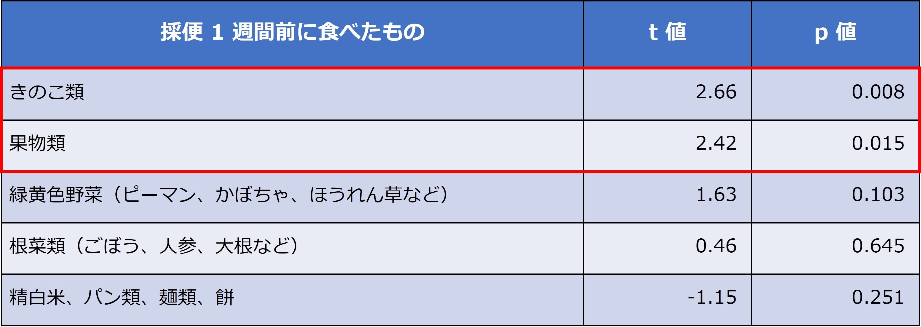 腸内フローラ判定※ 1 と、表に示した秋の味覚に関する質問項目の相関性を分析したところ、特に影響がある項目は「きのこ類」「果物類」となりました。