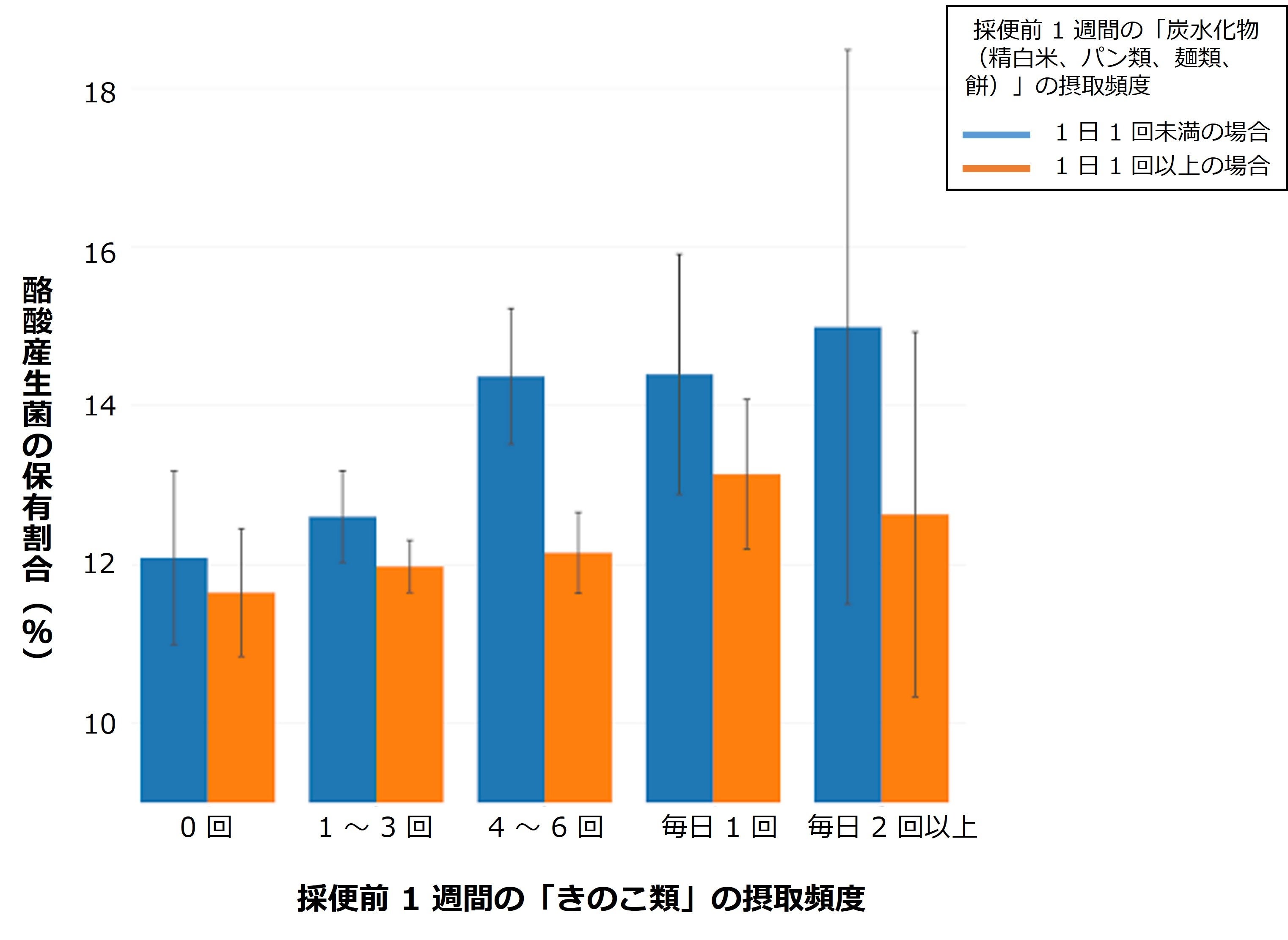 次に、腸内フローラ判定の高さに特に影響があった「きのこ類」に関して、きのこご飯といった白米との食べ合わせも考えられることから、「炭水化物(精白米、パン類、麺類、餅)」との関係性を探ります。どちらも一般的に酪酸産生菌※ 2 のエサとなることが知られているため、これらの摂取頻度と酪酸産生菌の保有割合を分析しました。結果は青で示した「炭水化物」の摂取頻度が 1 日 1 回未満の群のほうが、オレンジで示した 1日 1 回以上の群と比較して酪酸産生菌の保有割合が高く、さらに「きのこ類」の摂取頻度が多い人ほど保有割合も高いことがわかりました。