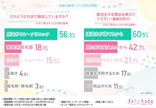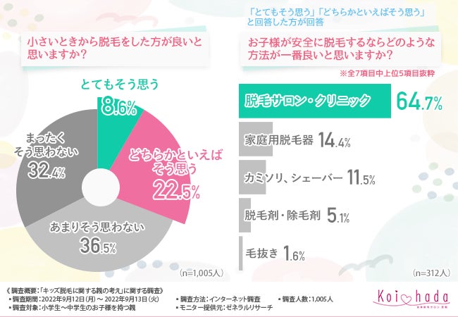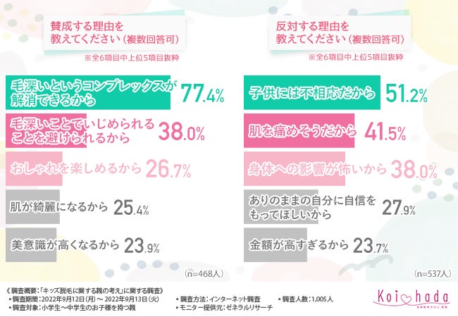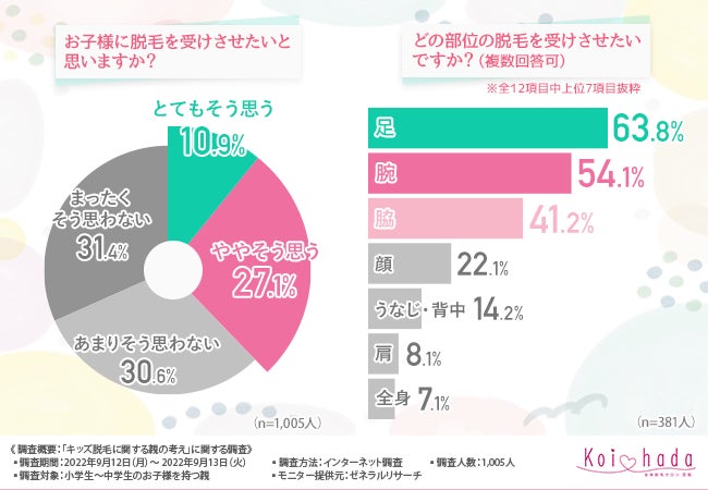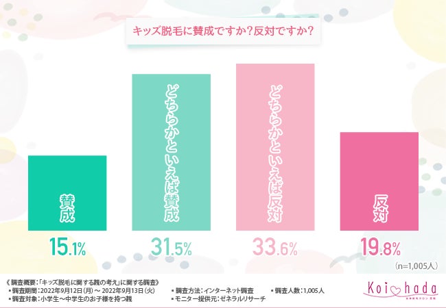 そこで今回、脱毛サロン「恋肌」(https://www.koi-hada.jp/lplj_lv/lp03/?refmedia=142)は、小学生〜中学生のお子様を持つ親を対象に、「キッズ脱毛に関する親の考え」に関する調査を実施しました。