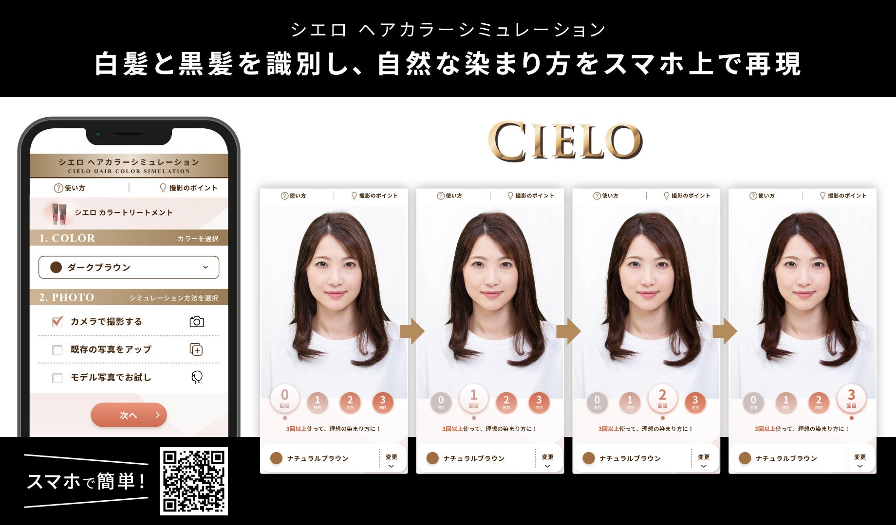 これまでもヘアカラーシミュレーションのアプリはありましたが、「白髪も黒髪も全く同じ色みで不自然な仕上がりイメージになる」ことが課題となっていました。今回のシエロ カラートリートメント用ヘアカラーシミュレーションは、地毛の白髪を正確に認識して白髪の色みが段階的に変化することで、より実際の染まりに近い自然な仕上がりイメージを体感できます。