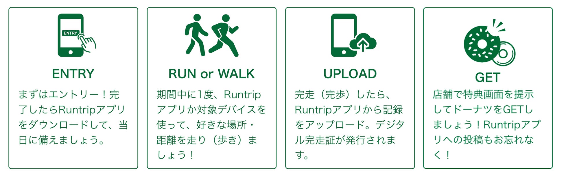 ランナー向けアプリを中心にメディア/ECサービスを展開する株式会社ラントリップ(本社:東京都渋谷区、代表取締役:大森 英一郎・以下ラントリップ)は、クリスピー・クリーム・ドーナツ・ジャパン株式会社(本社:東京都渋谷区、代表取締役社長:若月 貴子・以下クリスピー・クリーム・ドーナツ)と共同で、だれでも無料で参加可能なオンラインランニング・ウォーキングイベントを開催します。当イベントにおいて、指定の方法で運動を計測して完走された方には、お好きなドーナツと交換可能なクーポンを提供します。