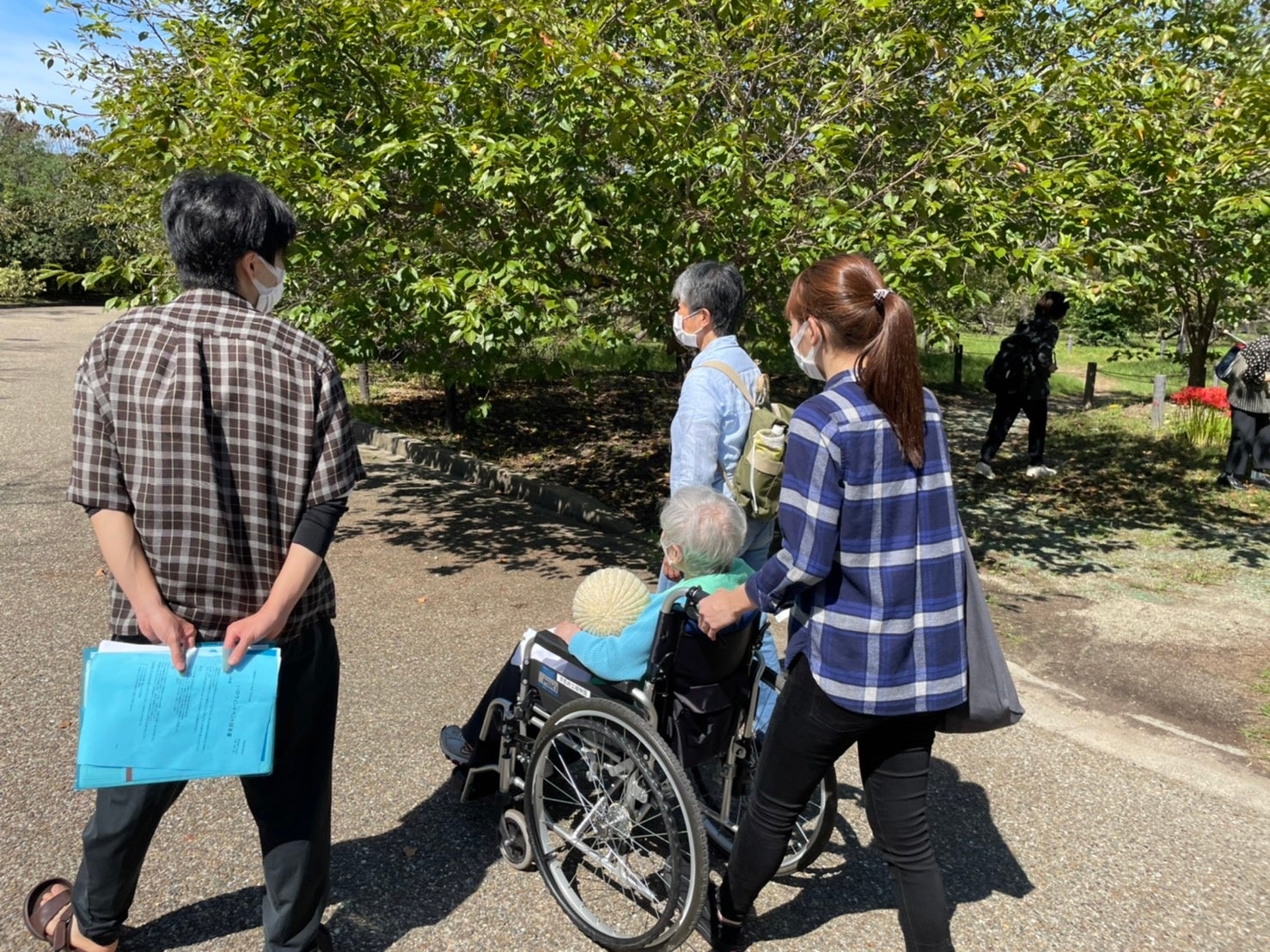 高齢者の車いすを大学生が押しながら植物を観賞したり、園内の広場では参加者全員で童謡『赤とんぼ』『虫の声』を歌ったりして、楽しい時間を過ごしました。