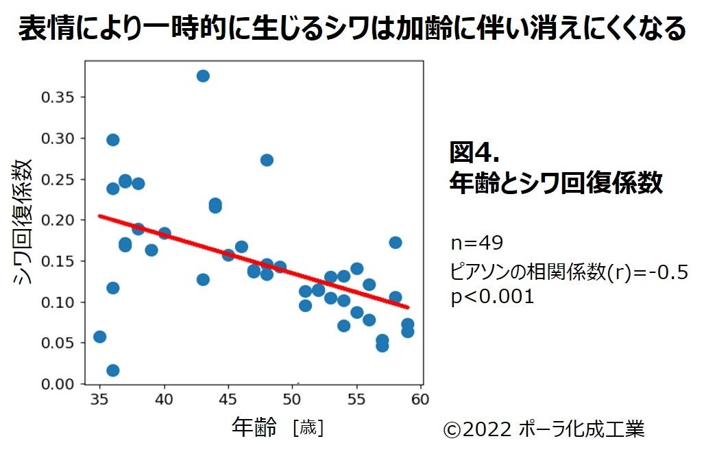 49名の被験者を対象に、シワ回復係数と年齢との関係を調べた結果、加齢に伴いシワ回復係数が小さくなったことから、加齢に伴いシワが消えにくくなる傾向が認められました。また、同年代の間にも差があり、若齢でもバラつきがあることも分かりました(図4)。このことは、若い人の中にも、表情によって一時的に生じるシワが消えにくいタイプがいることを意味します。