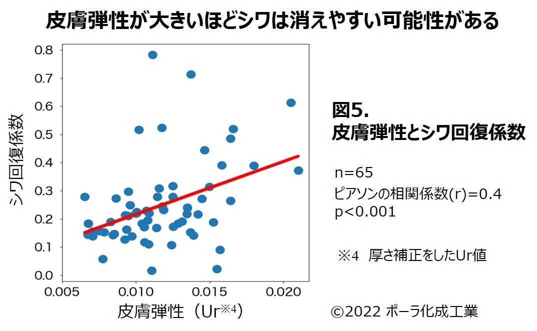 皮膚弾性は、加えていた圧力を取り除いた際に皮膚が元に戻ろうとする性質を示しており、皮膚弾性が大きいほど瞬時的に元に戻りやすいことを意味します。皮膚弾性とシワ回復係数との関係を調べた※3結果、比例関係にあることが分かりました(図5)。これより、皮膚弾性が大きいほどシワは消えやすい可能性があることが示唆されました。
