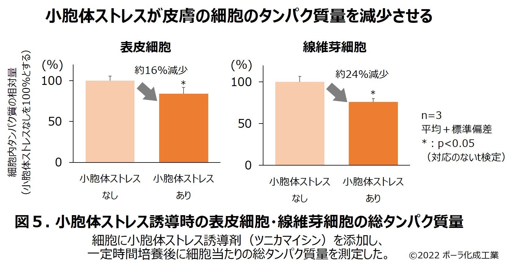 表皮細胞・線維芽細胞に対して小胞体ストレスを引き起こす薬剤を添加したところ、細胞当たりの総タンパク質量が減少しました(図5)。