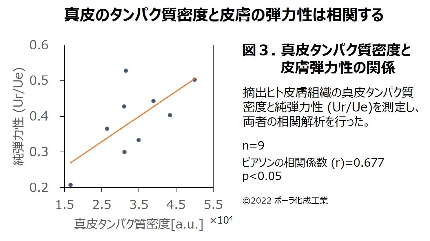 あらかじめ弾力性を測定しておいたヒトの皮膚組織を薄く切り出し、真皮のタンパク質を染色し画像解析によりタンパク質の密度を割り出しました。弾力性とタンパク質密度の関係を解析したところ、両者は相関関係にありました(図3)。