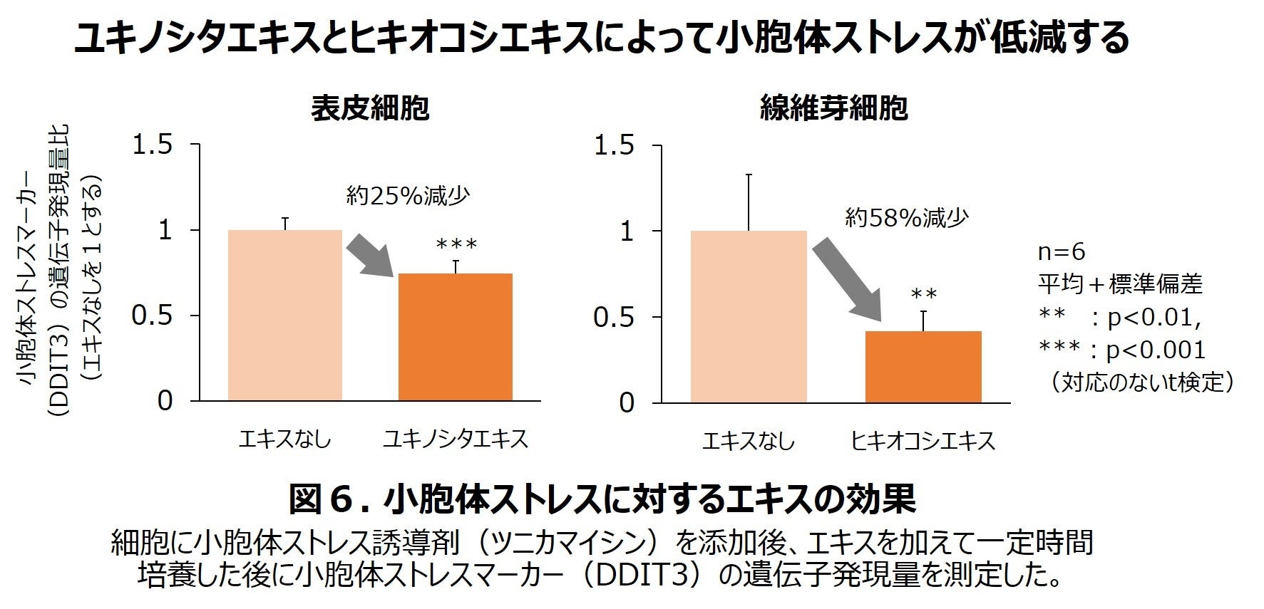 小胞体ストレスを低減するエキスを探索したところ、表皮細胞にはユキノシタエキスが、線維芽細胞にはヒキオコシエキスが有効でした(図6)。