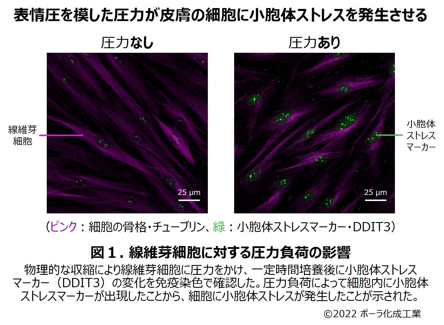 ①皮膚細胞に表情表出時のような圧力がかかると、タンパク質産生低下に繋がる「小胞体ストレス」が発生