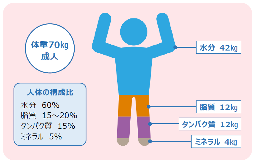 人体の構成を見てみると、水分、脂肪、タンパク質、ミネラルが4大要素として挙げられますが、いずれも体を正常に機能させるために必要不可欠なものばかりです。タンパク質は、体内で様々な役割を果たす最も重要な要素であり、健康のカギでもあります。体の組織の構築と修復を助け、代謝反応を可能にし、身体機能を調整します。加えて、タンパク質はpHと体液のバランスを適切に保つ働きもあります。つまり、タンパク質は栄養、筋肉、そして自己免疫力のための重要な栄養素であるといえます。