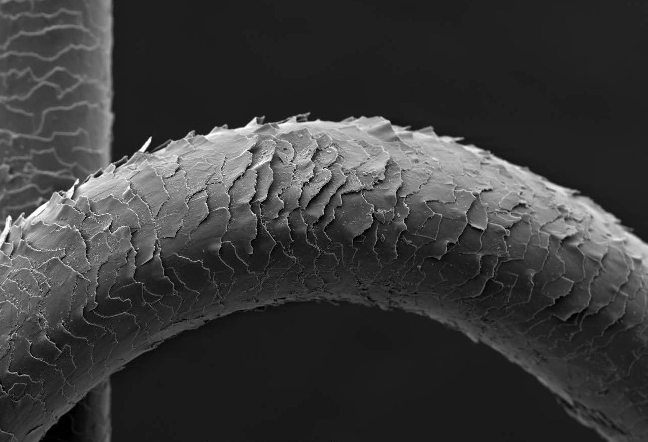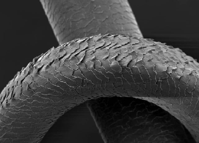 低分子ヒアルロン酸トリートメントを2週間使用前(左)使用後(右)の髪の毛を電子顕微鏡で比較した画像