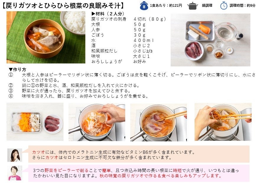 坪田先生と篠原さんが選んでくださった不眠の対策にぴったりな食材を中心に、秋の味覚やお得な食材も使った美味しい「良眠みそ汁」を6品考案しました。これからの秋に旬を迎える戻りガツオやさつまいも、しめじは、季節感を感じられ作る楽しみ・食べる楽しみを増してくれます。