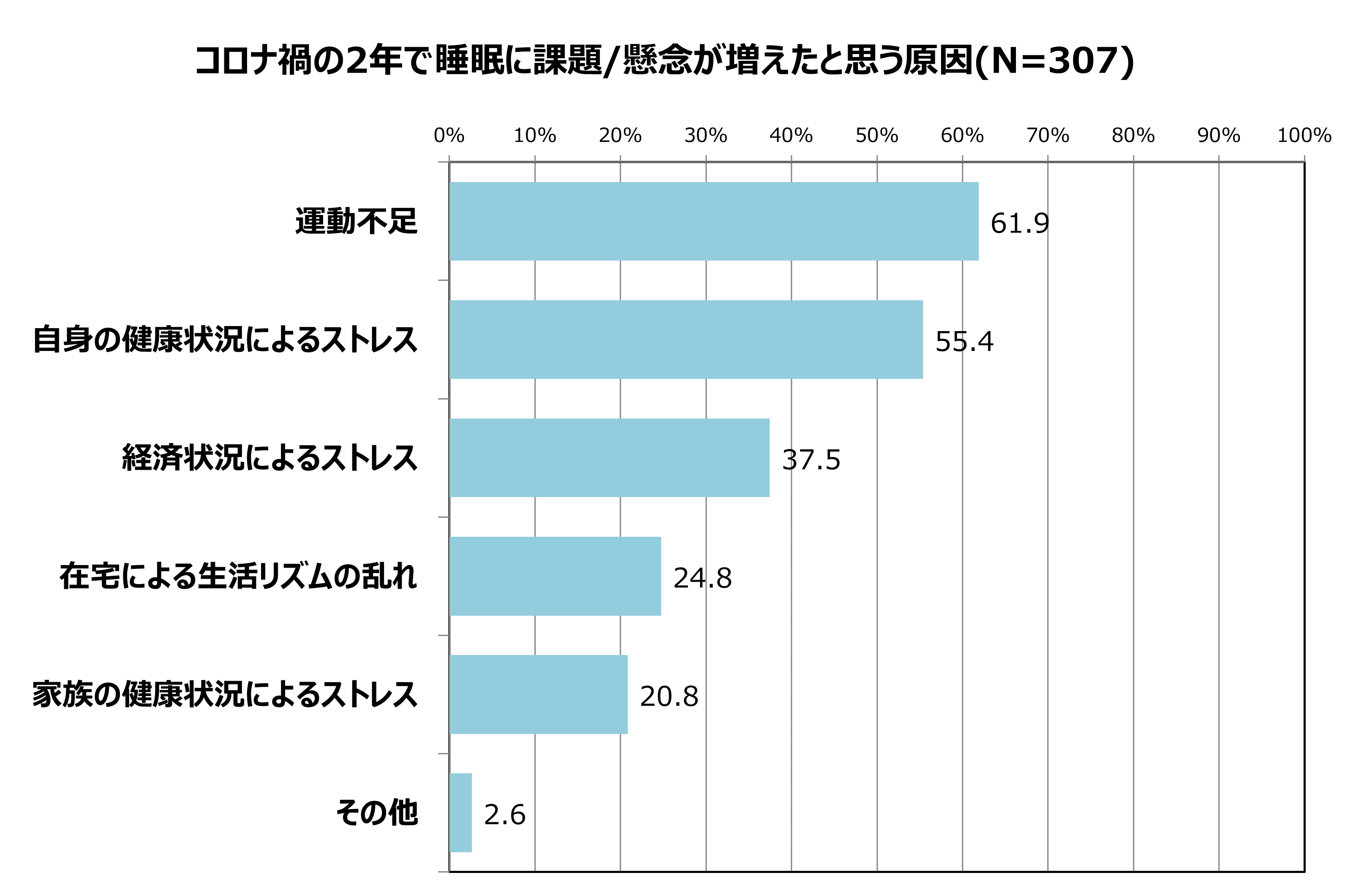 コロナ禍で睡眠への懸念が強まった人の中では、その原因について6割以上の人が「運動不足」、過半数の人が「自身の健康状況によるストレス」と考えています。長引いたコロナ禍やウクライナ情勢によると思われる経済状況によるストレスも、37%の人が原因として挙げています。